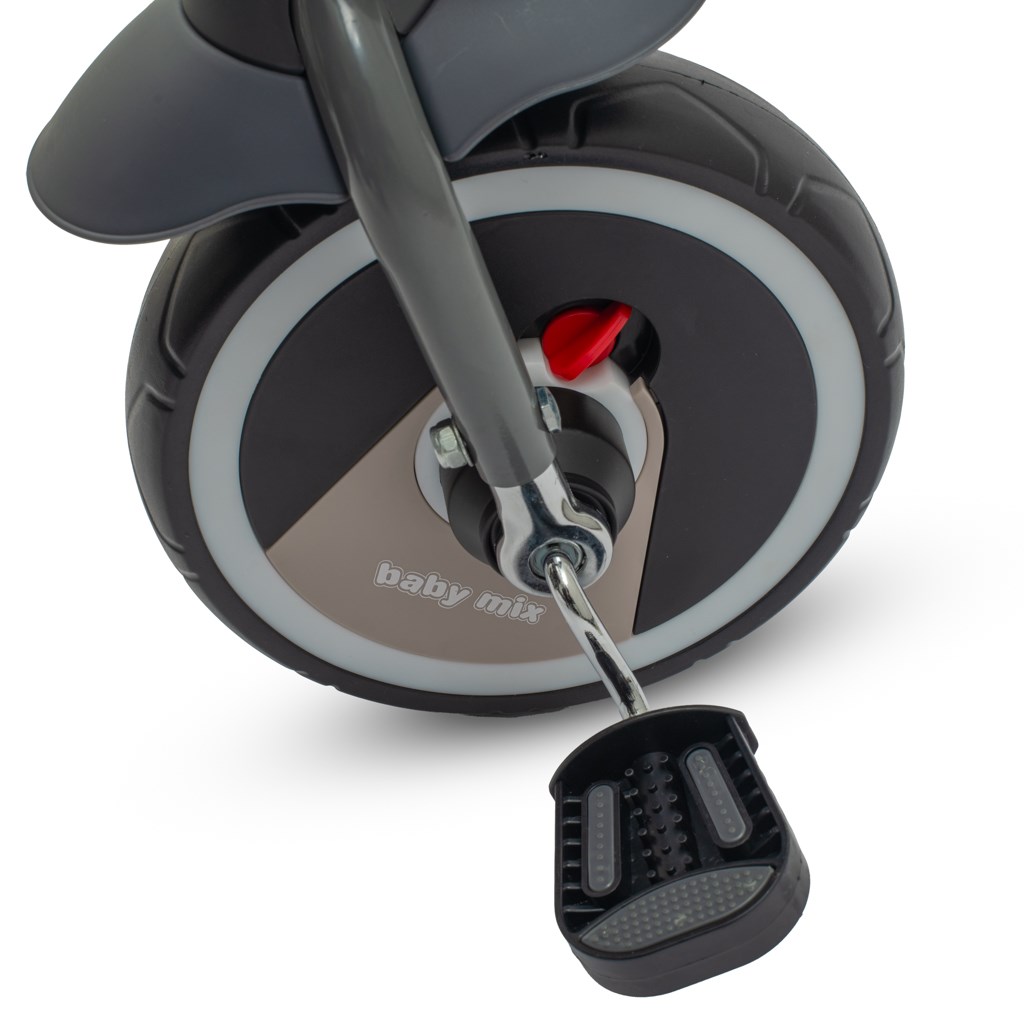 Rowerek został wyposażony w barierkę zabezpieczającą dziecko przed wypadnięciem, pięciopunktowe pasy bezpieczeństwa oraz podnóżki. Całość dopełniają nieprzebijalne piankowe koła EVA zapewniające odpowiednią przyczepność oraz cichą i komfortową jazdę na każdej nawierzchni. Komfortowe i wyprofilowane siedzisko zapewni wygodę podczas każdej podróży, a składany daszek uchroni maluszka przed nadmiarem słońca w upalne dni.