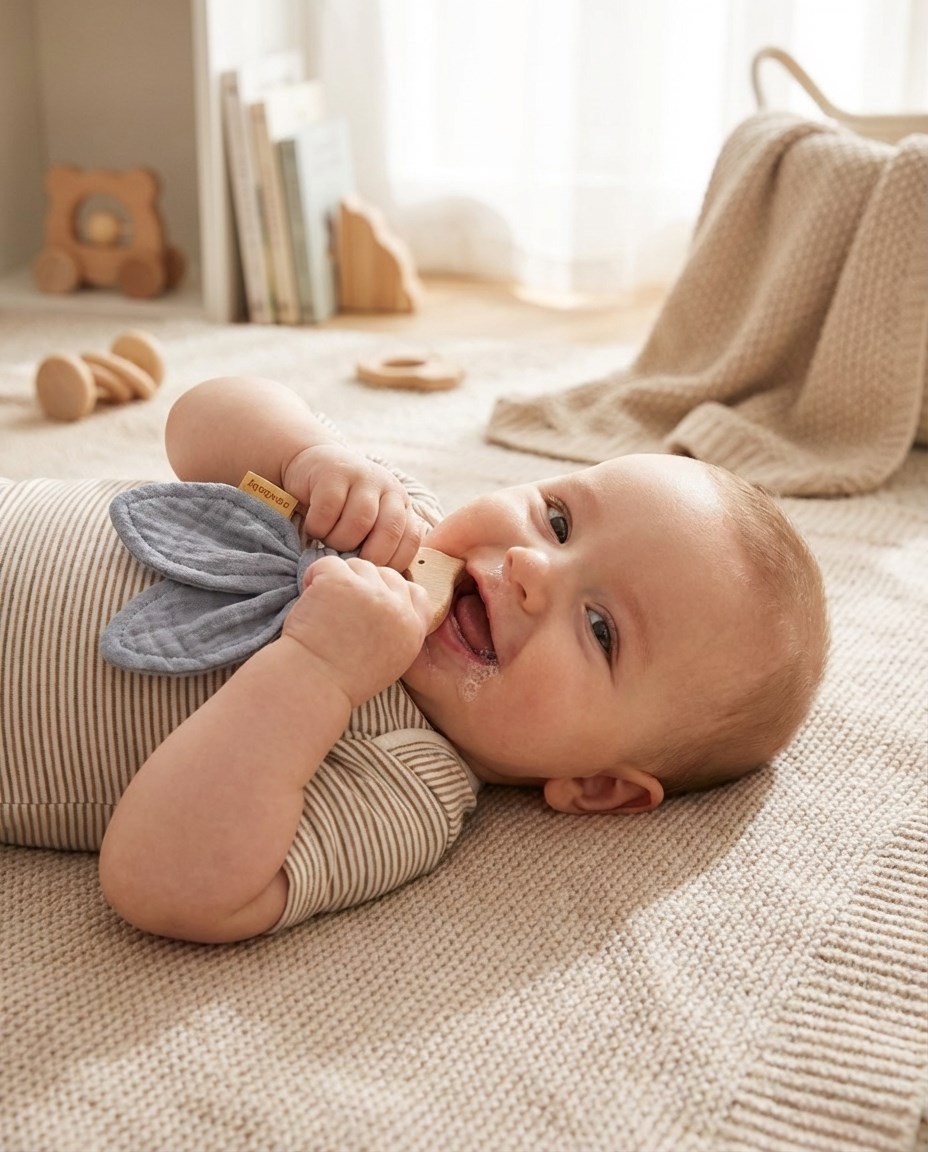 Gryzak z pieluszką muślinową to idealny zestaw przy ząbkowaniu niemowlaka. Gryzak wykonany z przyjaznego dla środkowa drewna bukowego oraz delikatnej tkaniny muślinowej. Całkowicie bezpieczny dla niemowląt przynosi ukojenie w czasie ząbkowania. Gryzak może również posłużyć jako zabawka dla dzieci. Gryzak idealnie pasuje do innych naszych muślinowych produktów tworząc piękny zestaw, który można podarować na Baby Shower.