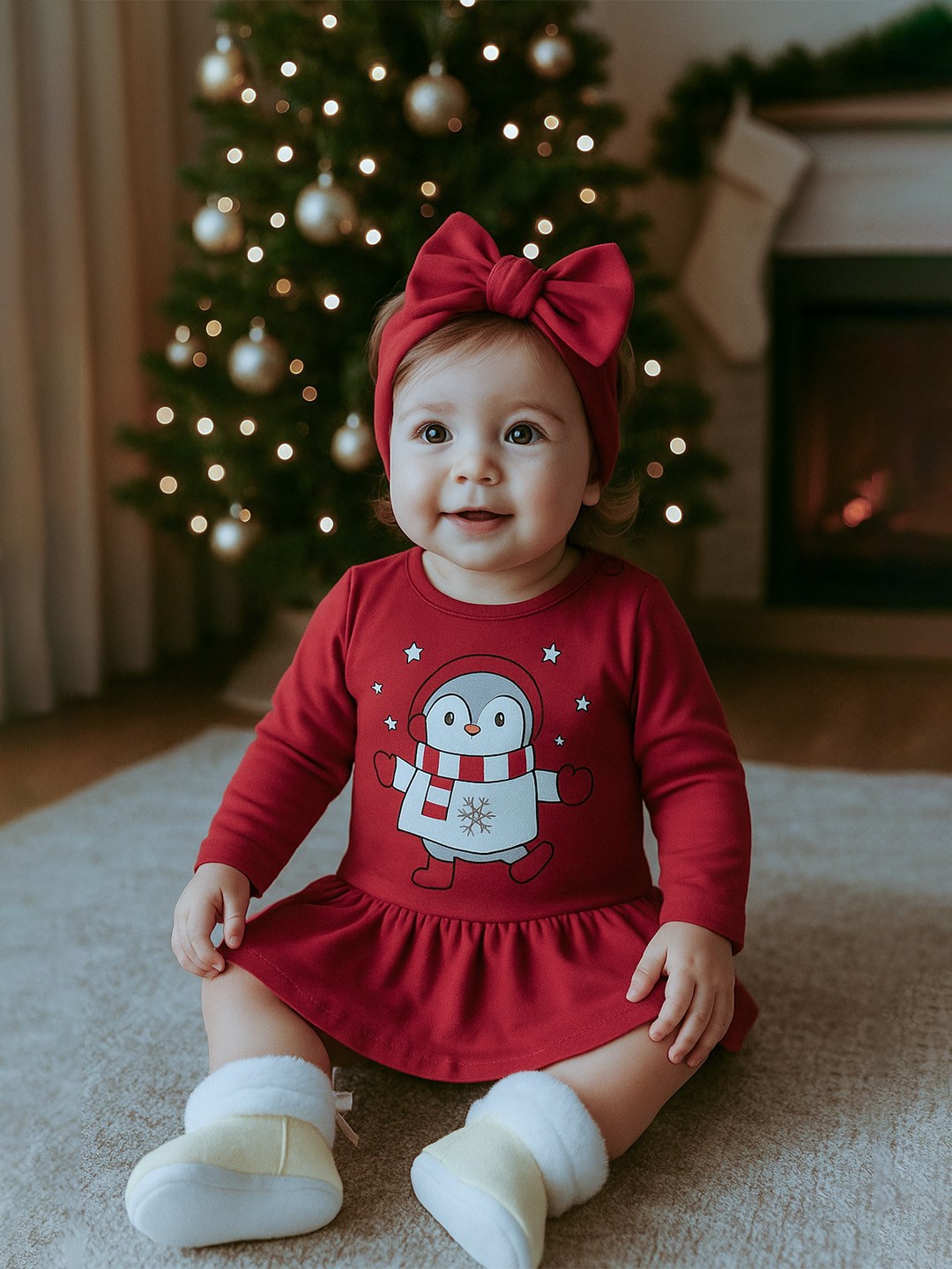 Piękna, bawełniana sukienka niemowlęca z opaską na włosy New Baby Winter Penguin dla wszystkich małych dam. Sukienka z długim rękawem w pięknym czerwonym kolorze są ozdobione obrazkiem uroczego, wesołego pingwina. Zapinanie na napy na ramieniu ułatwia zakładanie. Sukienka wykonana z bardzo przyjemnego materiału wysokiej jakości, idealnego dla niemowląt. Piękna, bawełniana opaska na głowę dla dziewczynki sprawi radość małej elegantce. Opaska jest elastyczna, dobrze się dopasowuje. Skład: 100% bawełna.