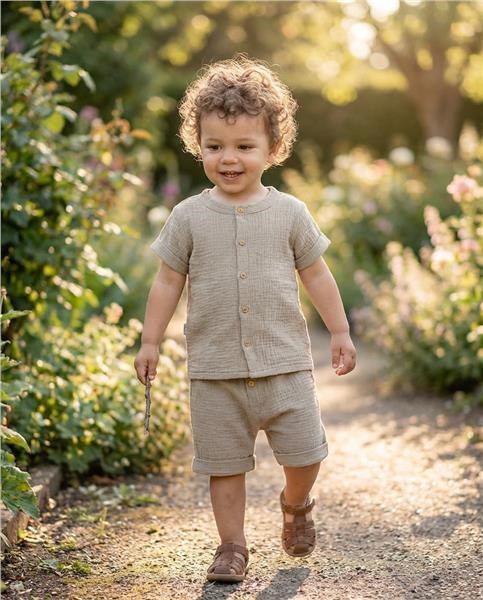 Stylowy 2-częściowy zestaw muślinowy dla niemowląt New Baby. Wyprawka zawiera koszulkę i spodenki. Koszulka z krótkim rękawem posiada zapięcie na guziki.