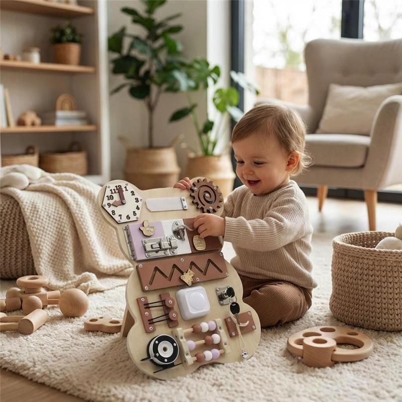 Drewniana tablica manipulacyjna Busy Board w kształcie misia zapewni dzieciom rozrywkę na długie godziny, a jednocześnie wspiera ich naturalny rozwój. Dzięki połączeniu różnych elementów dziecko ćwiczy motorykę małą, cierpliwość oraz logiczne myślenie – w zabawny i bezpieczny sposób.