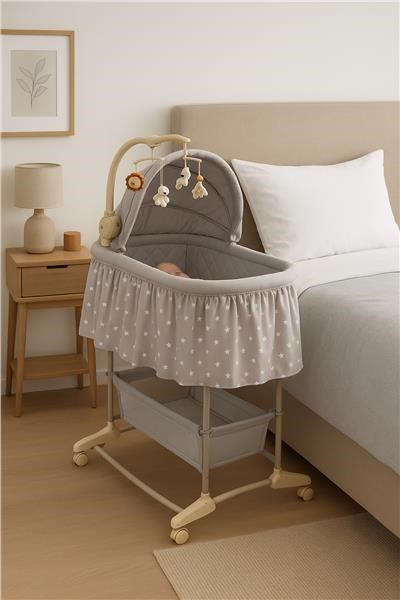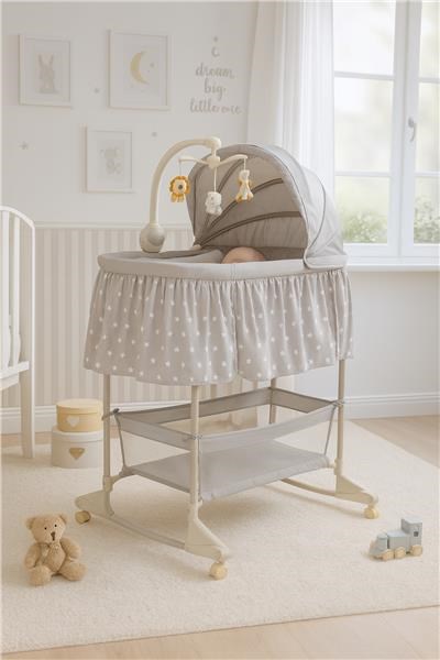 Kołyska niemowlęca New Baby. Kołyska jest idealną opcją zarówno dla dzieci, jak również rodziców, dla których funkcjonalność oraz bezpieczeństwo stanowią kluczowe cechy. Produkt może pełnić funkcję łóżeczka oraz kołyski. Mobilność kołyski daje ogromny komfort bo dziecko zawsze będzie blisko rodziców. Posiada dolny koszyk co pozwoli nam na trzymanie niezbędnych rzeczy zawsze blisko dziecka i na czas zareagowanie na jego potrzeby nie oddalając się od niego zanadto. Poszycie kołyski wykonane jest z przyjemnego w dotyku i przewiewnego materiału który można prać. Posiada karuzelę z kolorowymi zwierzątkami i melodiami. Kołyska ma opuszczaną ściankę boczną co w zestawie z lampką wbudowaną w karuzeli zapewni ogromny komfort przy codziennej i często nocnej opiece nad dzieckiem.