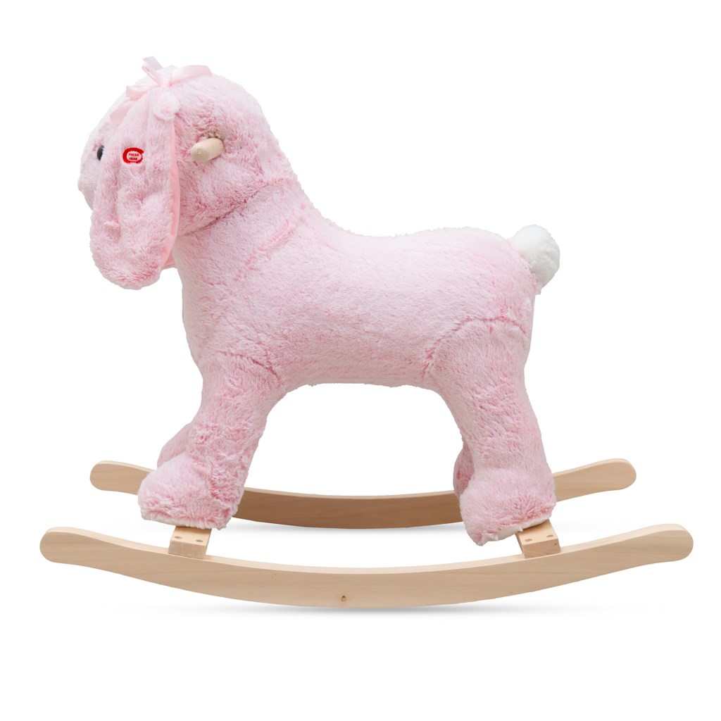 Stabilne drewniane płozy i uchwyty do trzymania gwarantują bezpieczne bujanie, a funkcja melodii aktywowana przyciskiem rozwija zmysł słuchu i sprawia dzieciom mnóstwo radości. Królik posiada wygodne siedzisko bez oparcia – idealny dla nieco starszych maluchów, którzy potrafią samodzielnie utrzymać równowagę.